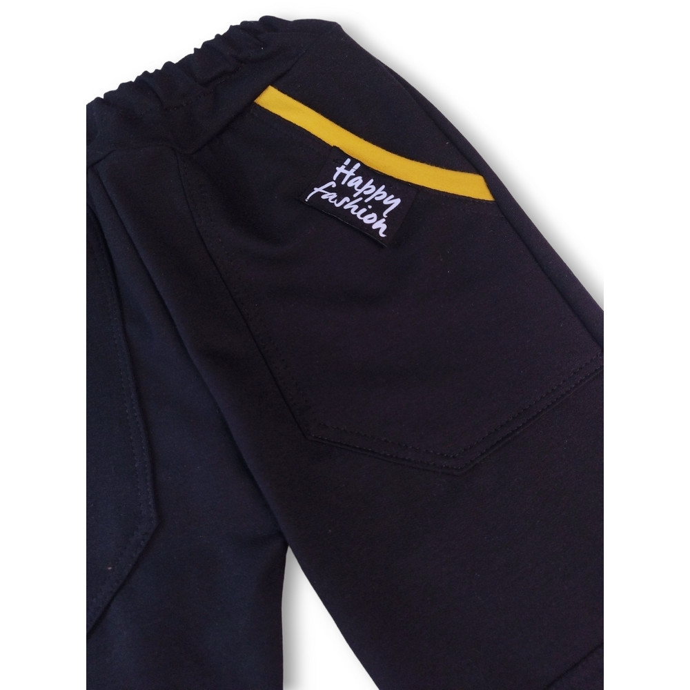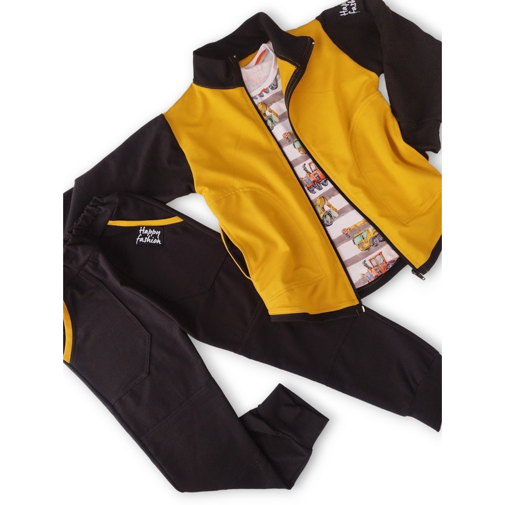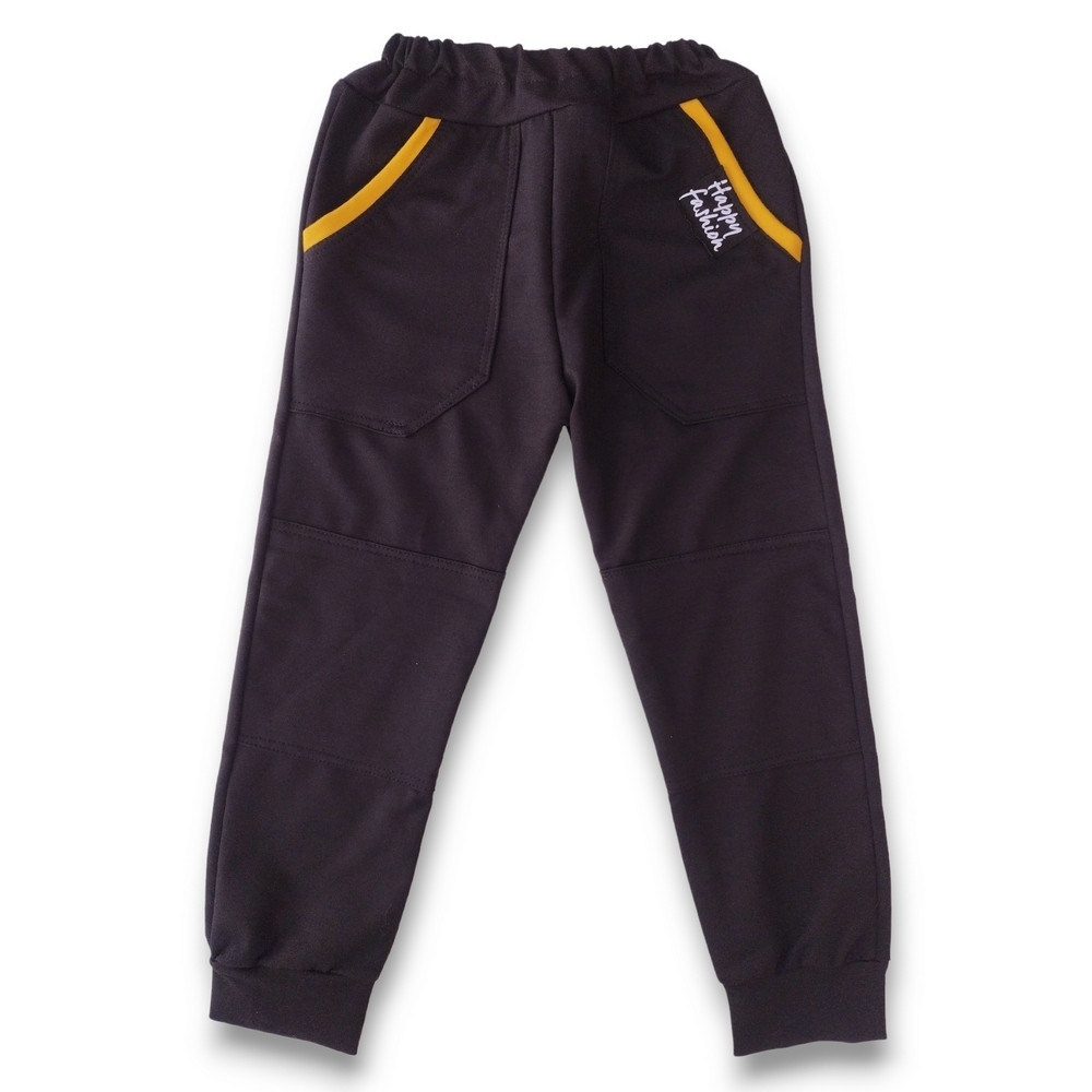 Pohodlné chlapčenské tepláky čiernej farby sú v páse na gumičku a majú dve predné vrecká, ktoré sú doplnené horčicovo-žltou, aby ladili s bundičkou.