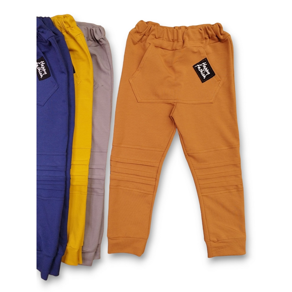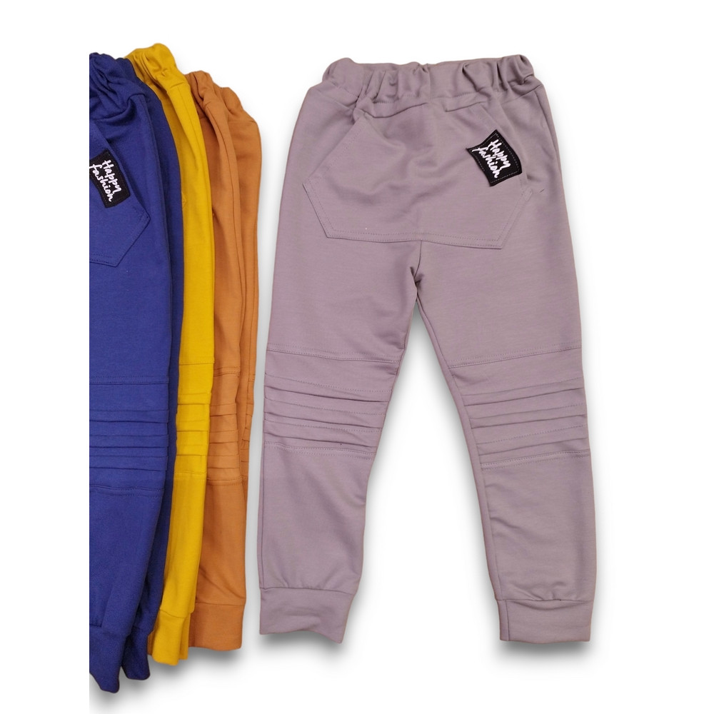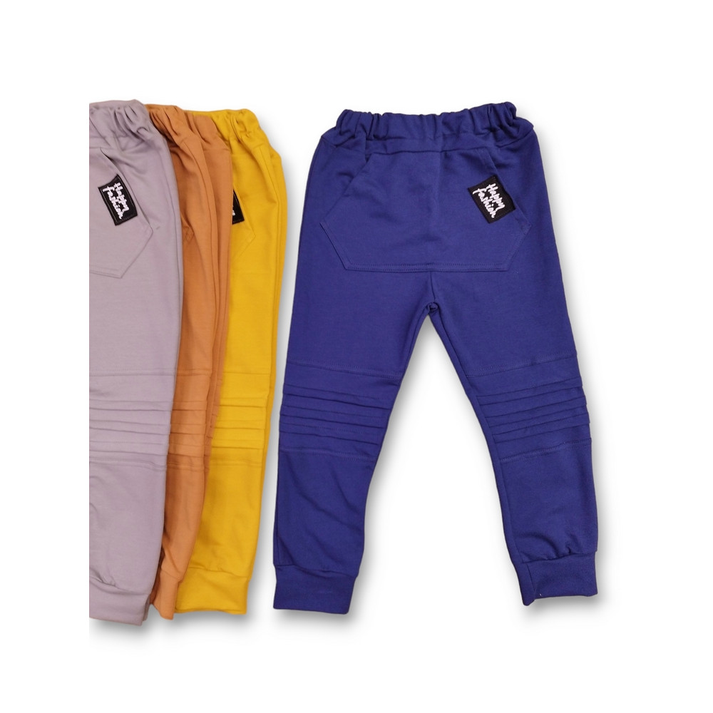 Nohavice sú v páse na gumičku, majú jedno predné vrecko - tzv. klokanček a štýlové prešitie v oblasti kolien.