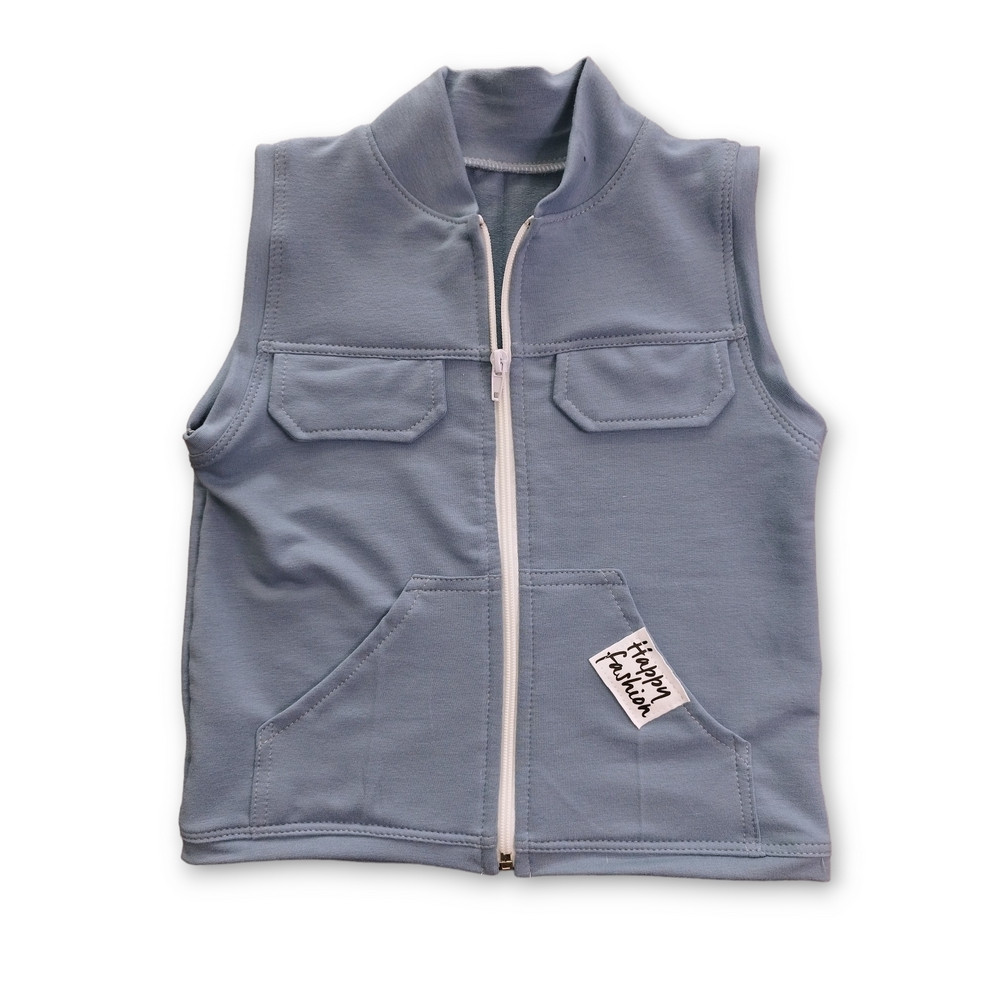 Pohodlná tepláková vesta má dve predné vrecká, dve ozdobné a spodný pás z rovnakej látky.